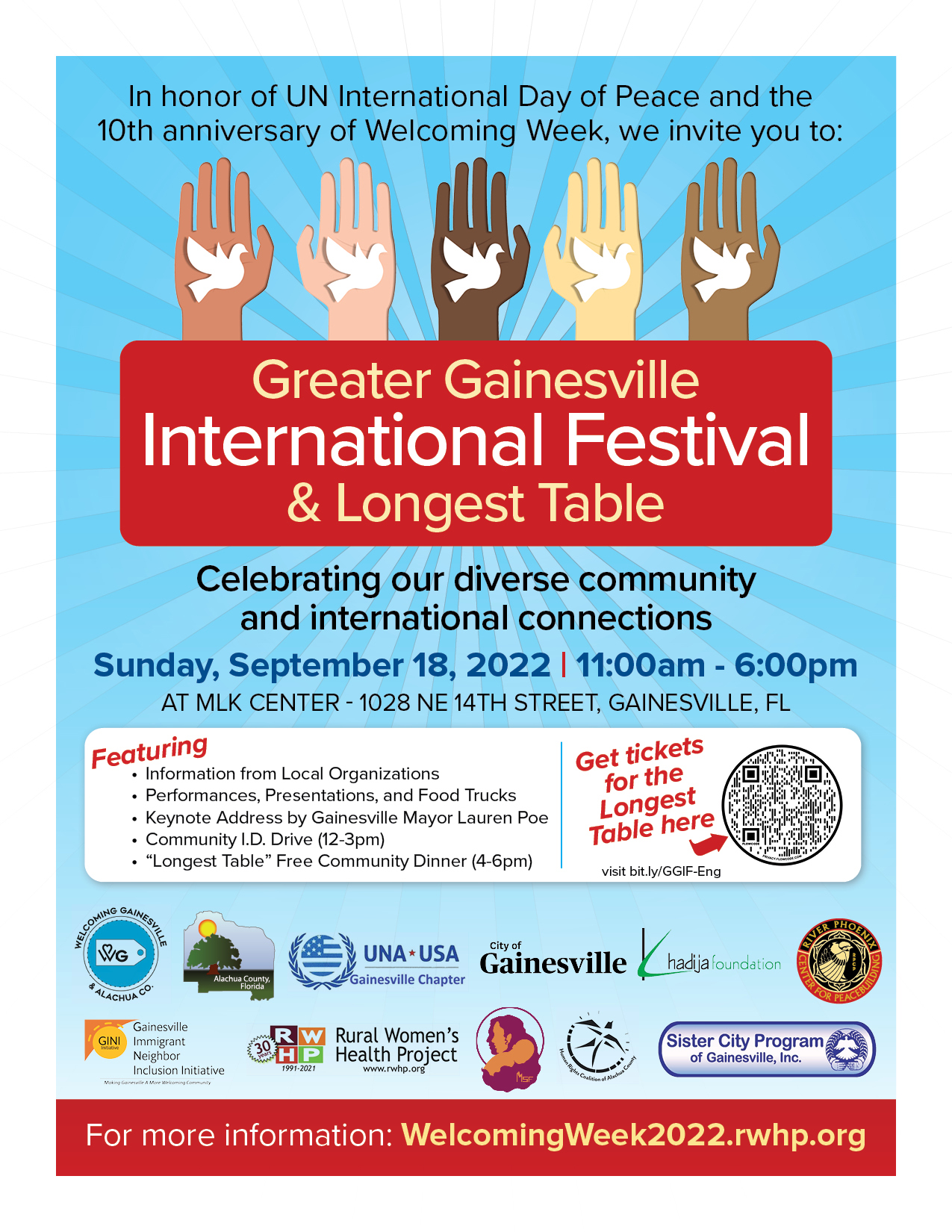 Ajude-nos a celebrar nossa comunidade diversificada e conexões internacionais no Festival Internacional de Greater Gainesville deste ano. Aprecie as performances e apresentações, saboreie as diversas comidas e aproveite as informações e serviços disponibilizados por algumas de nossas organizações locais! Não se esqueça de solicitar uma Identificação da comunidade!